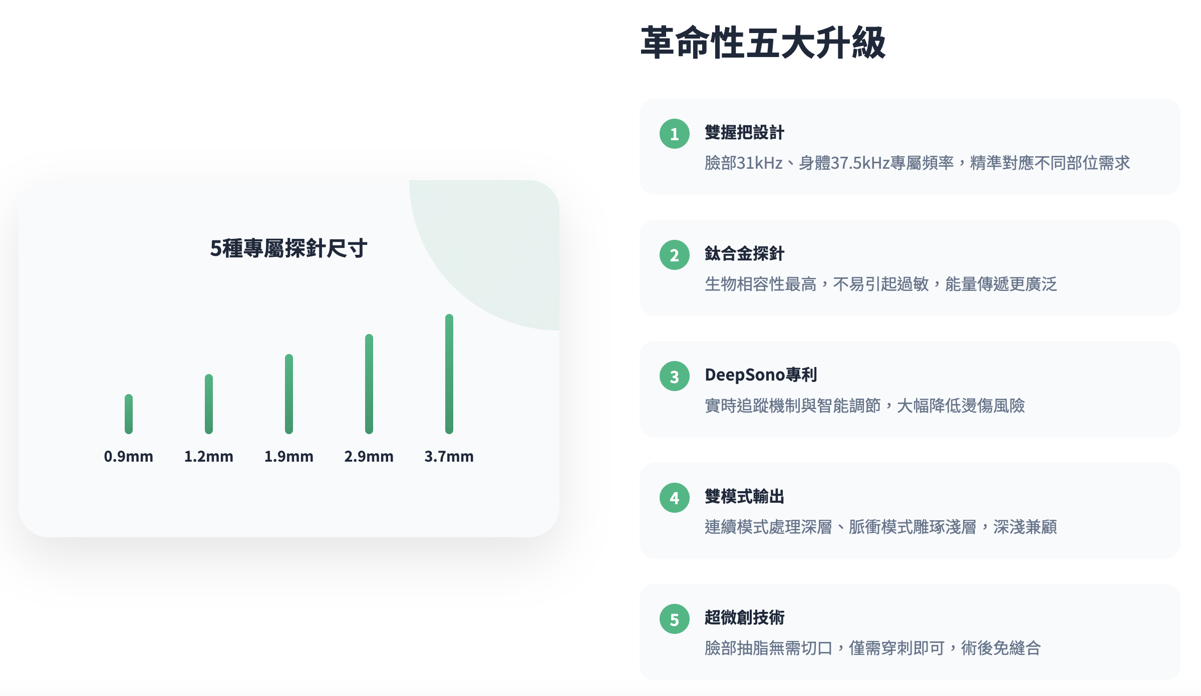 擁有DeepSono專利、不產生高溫、脂肪選擇性、鈦合金材質等多重安全保障。