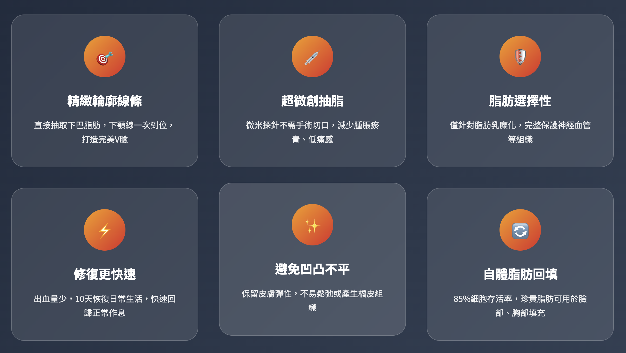 - 超微創技術 臉部抽脂無需切口,僅需穿刺即可,術後免縫合
