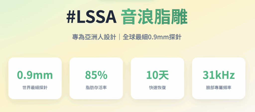 - LSSA音浪脂雕:‧ 探針最細達0.9mm,適合精細部位雕塑‧ 臉部抽脂可免切口,僅需穿刺‧ 專為亞洲人設計,針對易留疤體質‧ 雙握把設計,臉部與身體專屬頻率