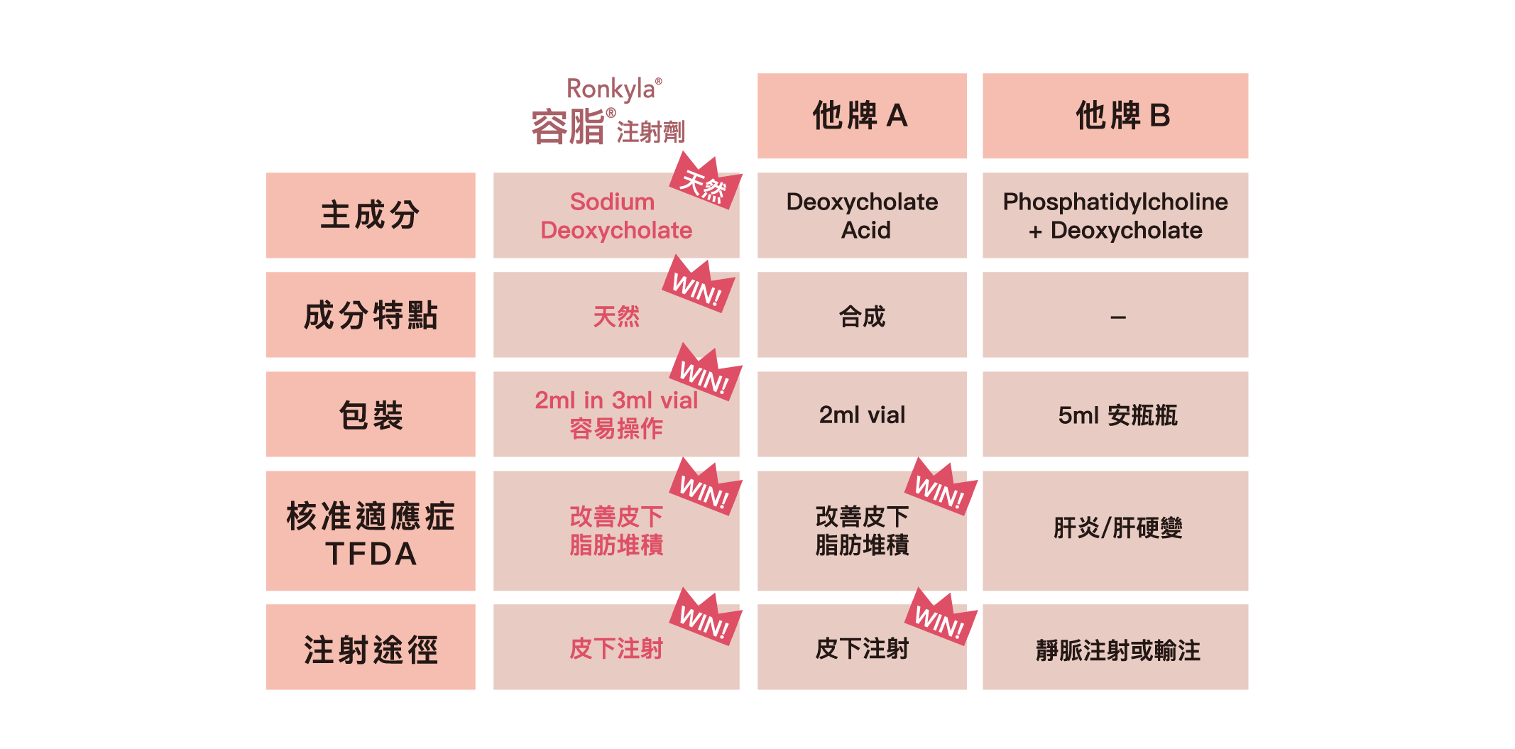 - 相較其他溶脂產品,腫脹和疼痛程度較低