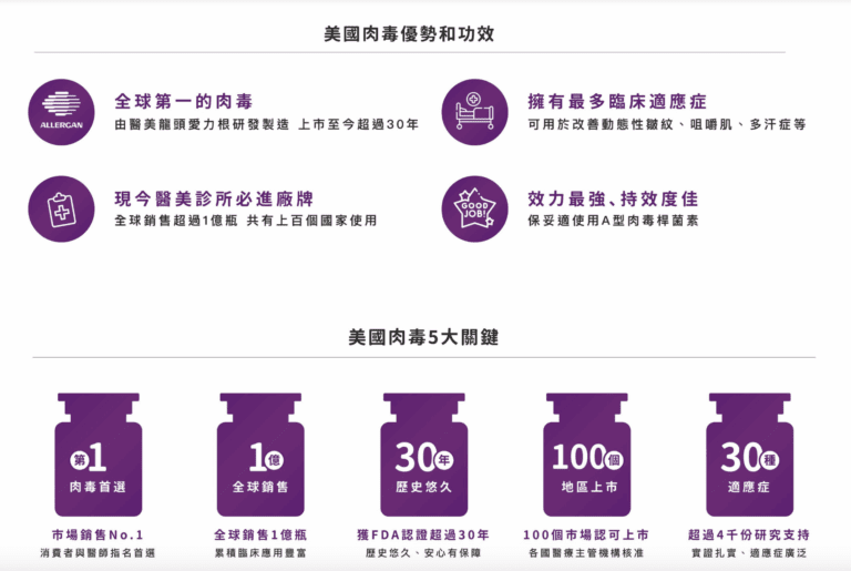 在全球95個國家獲得認證,每年有超過600萬人次選擇BOTOX進行治療,是目前臨床研究最完整、安全數據最豐富的肉毒桿菌素品牌。