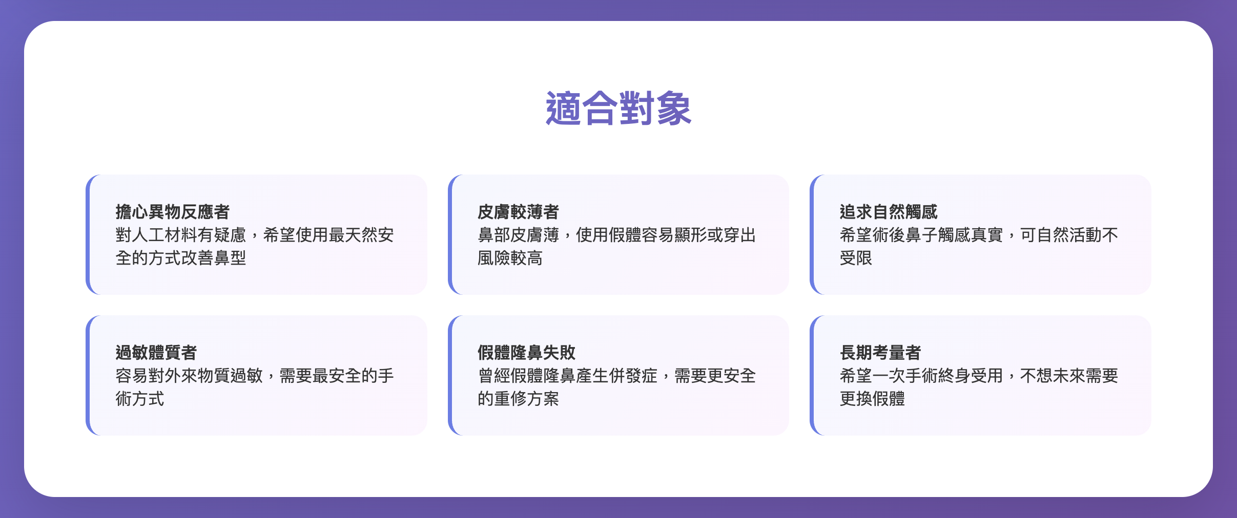 - 擔心異物反應者:對人工材料有疑慮,希望使用最天然安全的方式改善鼻型
