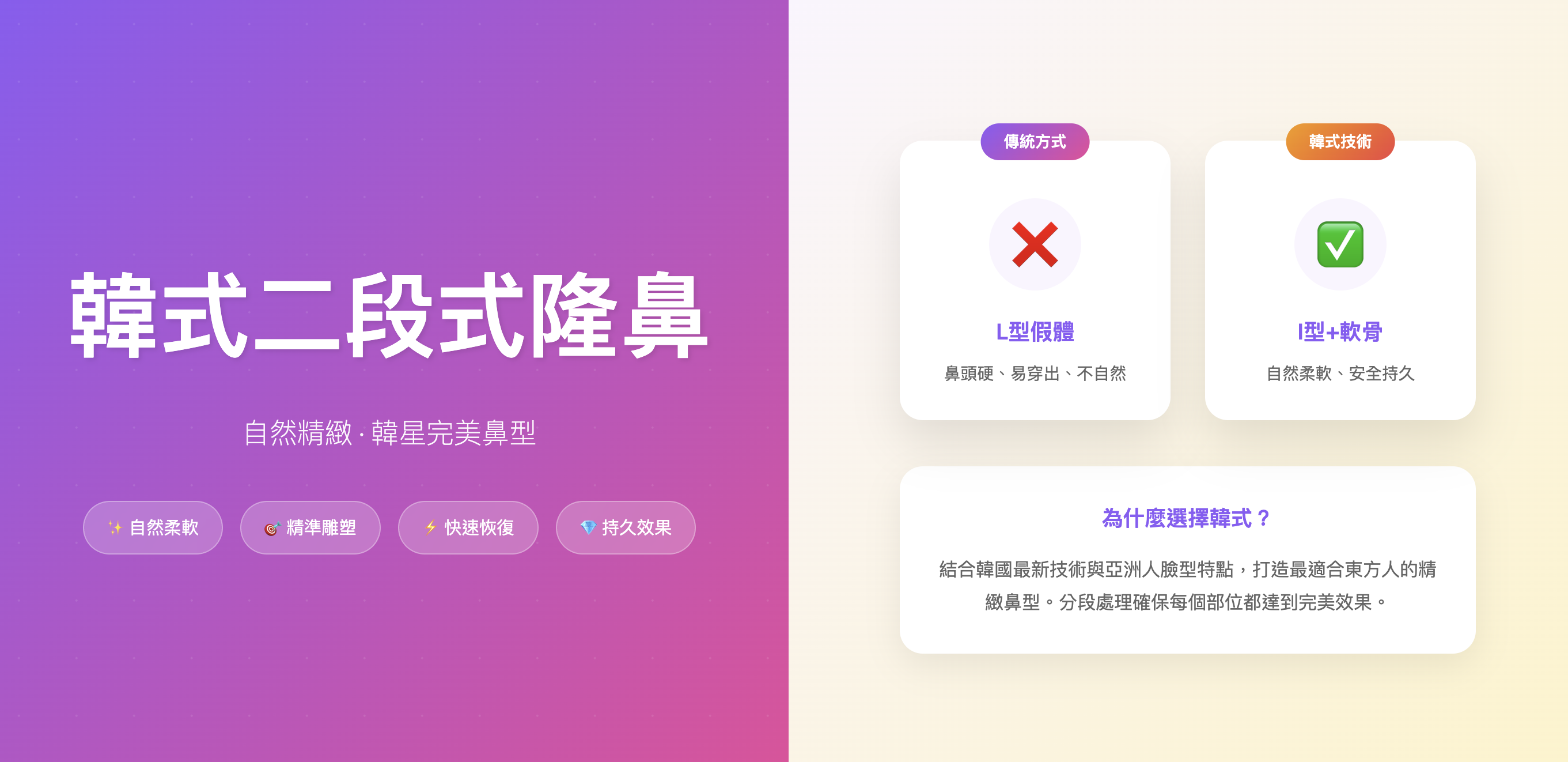 韓式二段式隆鼻源自韓國整形技術,將隆鼻手術分為鼻樑和鼻頭兩個部分分別處理。鼻樑使用I型假體墊高,鼻頭則採用自體軟骨進行精雕,避免傳統L型假體容易造成鼻頭穿出的問題。這種技術既能創造挺直的鼻樑,又能塑造自然柔軟的鼻頭,是目前亞洲最受歡迎的隆鼻方式,特別適合追求自然美感的東方人。