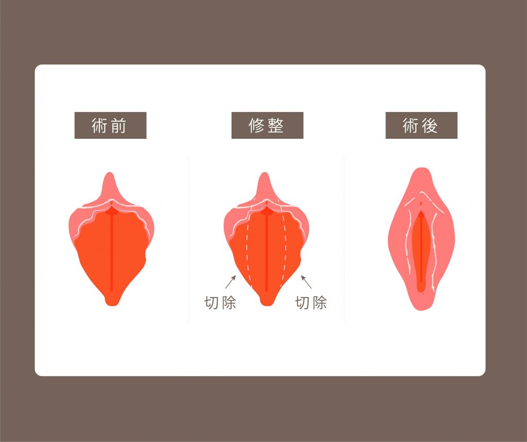 若有這類問題,可以使用陰唇側緣切除法,直接切除小陰唇末端多餘的贅肉與深色皮膚,再根據患者的問題做適當剪裁與調整,有效改善陰唇外觀、鬆弛皺摺等問題恢復緊緻。