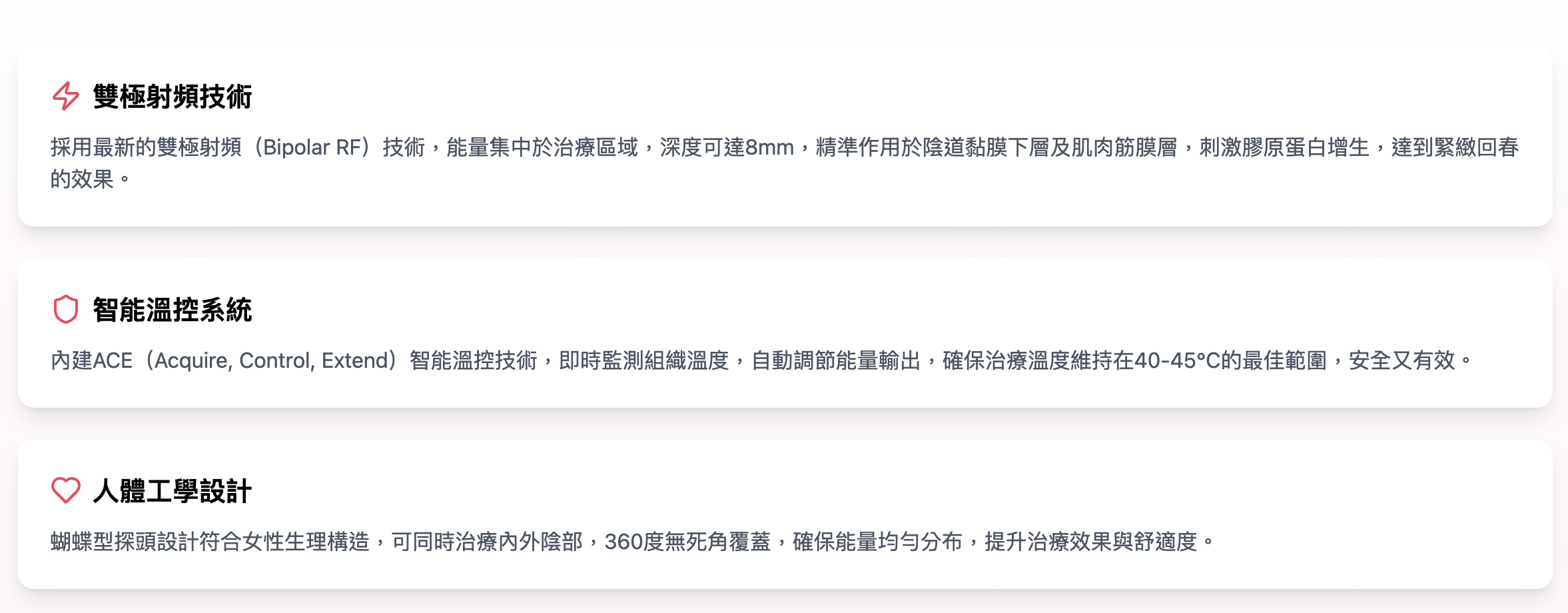 採用最新的雙極射頻(Bipolar RF)技術,能量集中於治療區域,深度可達8mm,精準作用於陰道黏膜下層及肌肉筋膜層。射頻能量在組織中產生熱效應,促使膠原蛋白立即收縮,並啟動纖維母細胞的活化,刺激新生膠原蛋白與彈性纖維的生成,達到組織重塑與緊緻回春的效果。