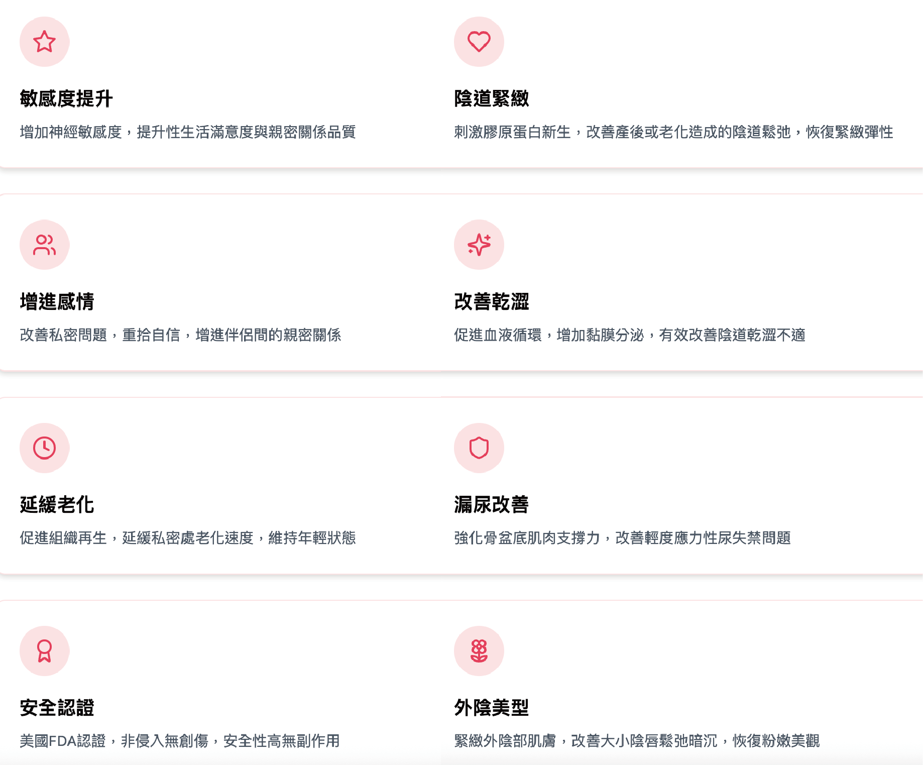改善陰道壁的神經敏感度與血液循環,增加性愛過程中的感受度。研究顯示,85%的女性在療程後表示性滿意度提升。