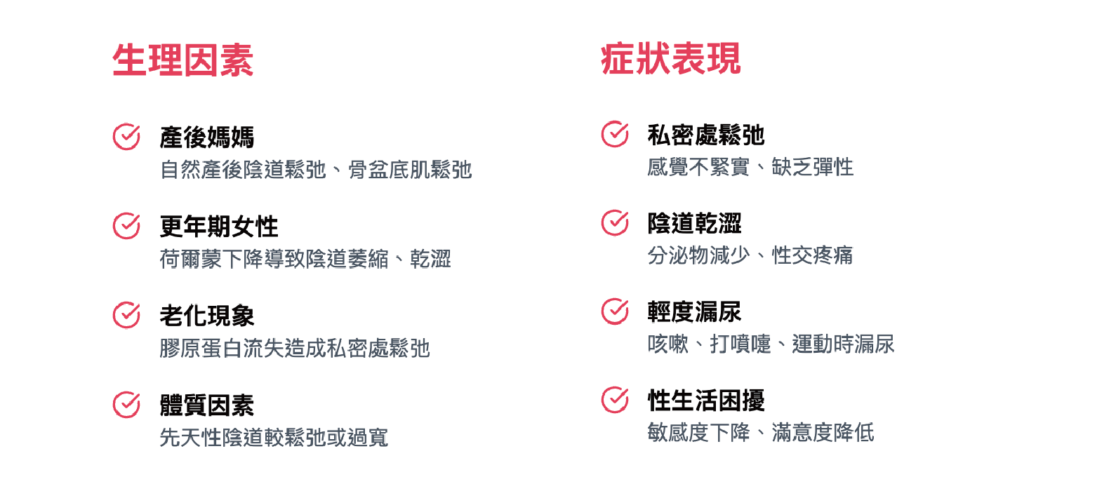 綜合改善各種私密困擾,讓女性在生理與心理上都獲得提升,享受更自在、更有品質的生活。