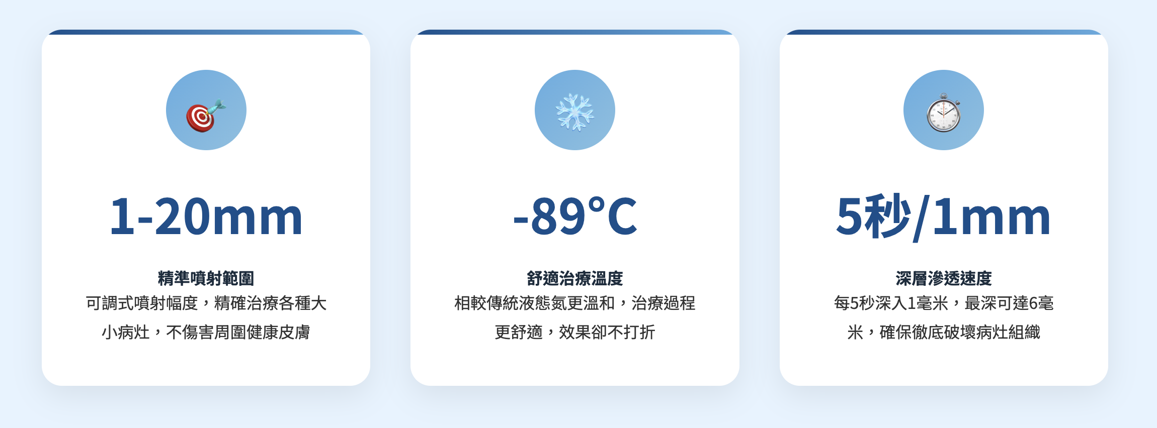 使用 -89°C 溫度,相較傳統 -196°C 溫和許多。大多數患者僅感受輕微刺痛或麻木感,治療時間短暫,不適感很快消失。