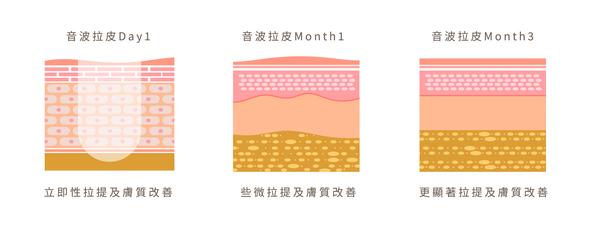 精準地使超聲波從淺至深透入不同皮層,達到拉提的效果,進而滿足不同老化程度的需求。