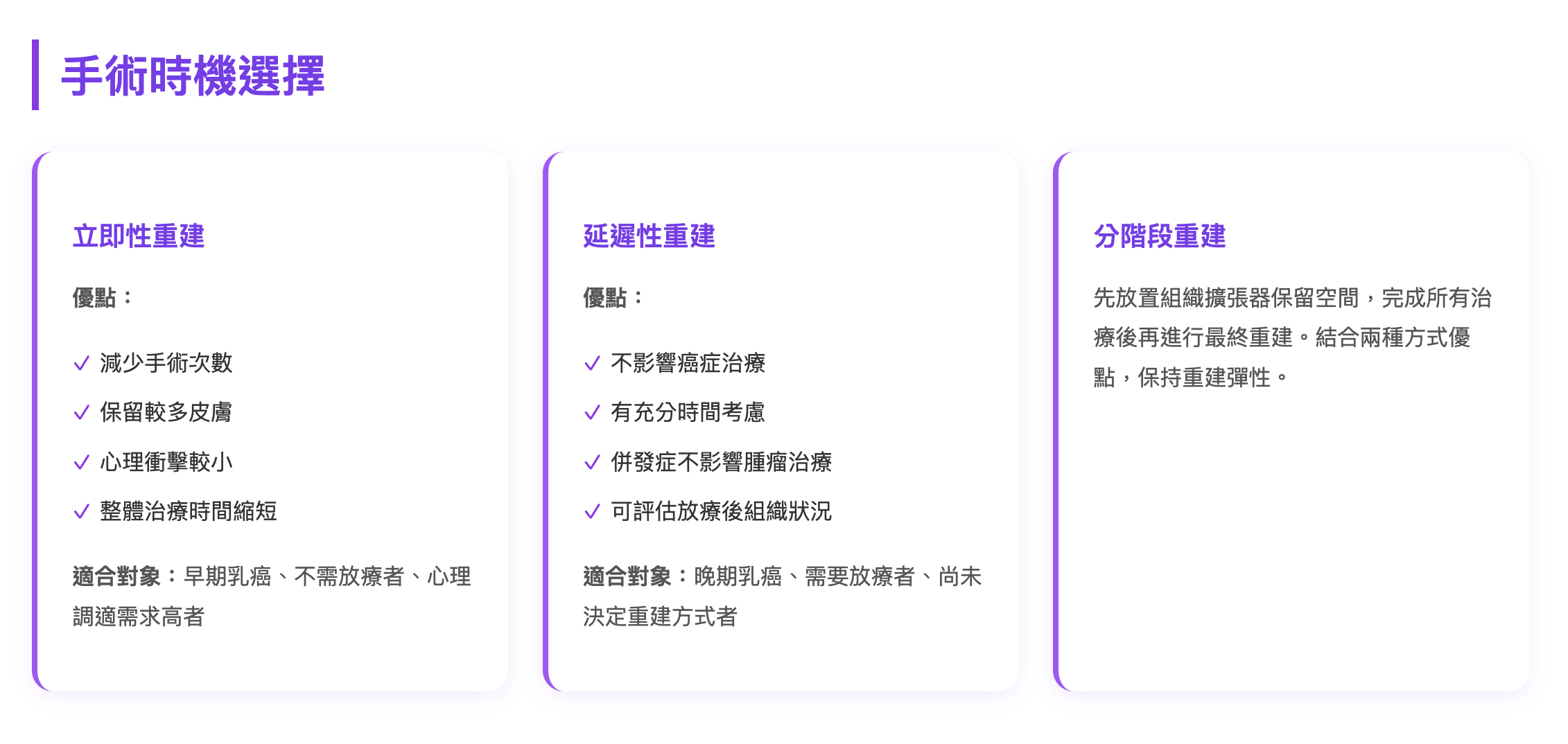 - 適合對象:晚期乳癌、需要放療者、尚未決定重建方式者