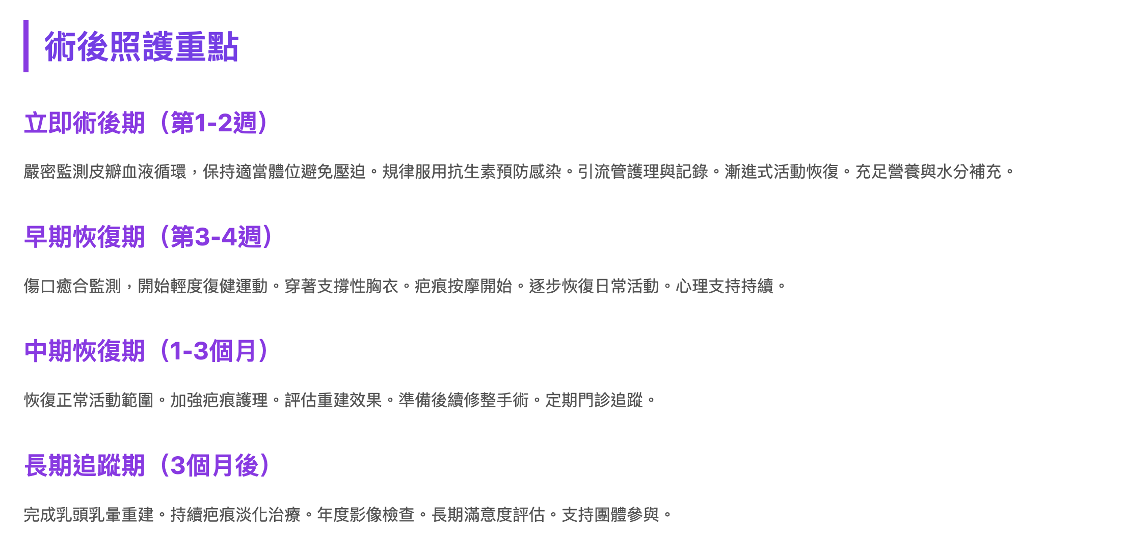 傷口癒合監測,開始輕度復健運動。穿著支撐性胸衣。疤痕按摩開始。逐步恢復日常活動。心理支持持續。
