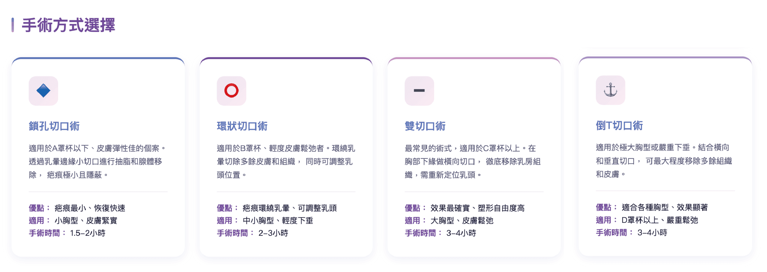 適用於極大胸型或嚴重下垂。結合橫向和垂直切口,可最大程度移除多餘組織和皮膚。