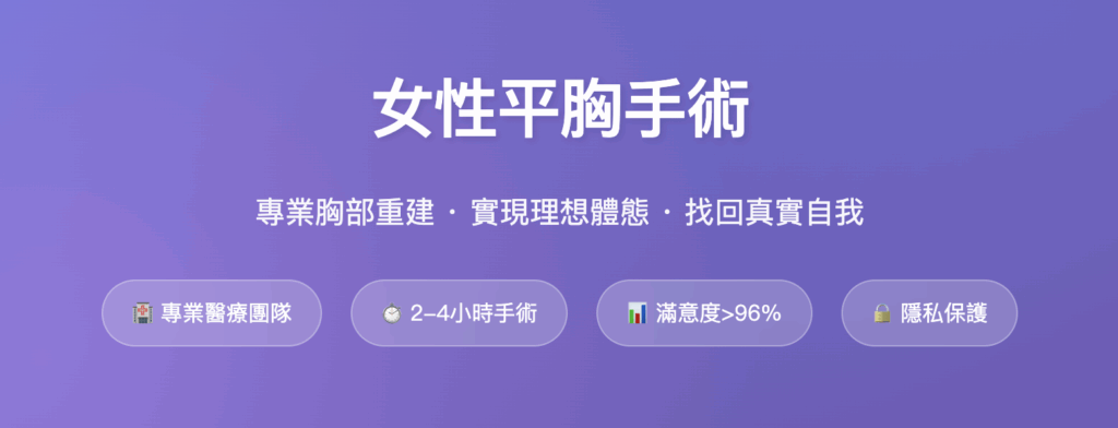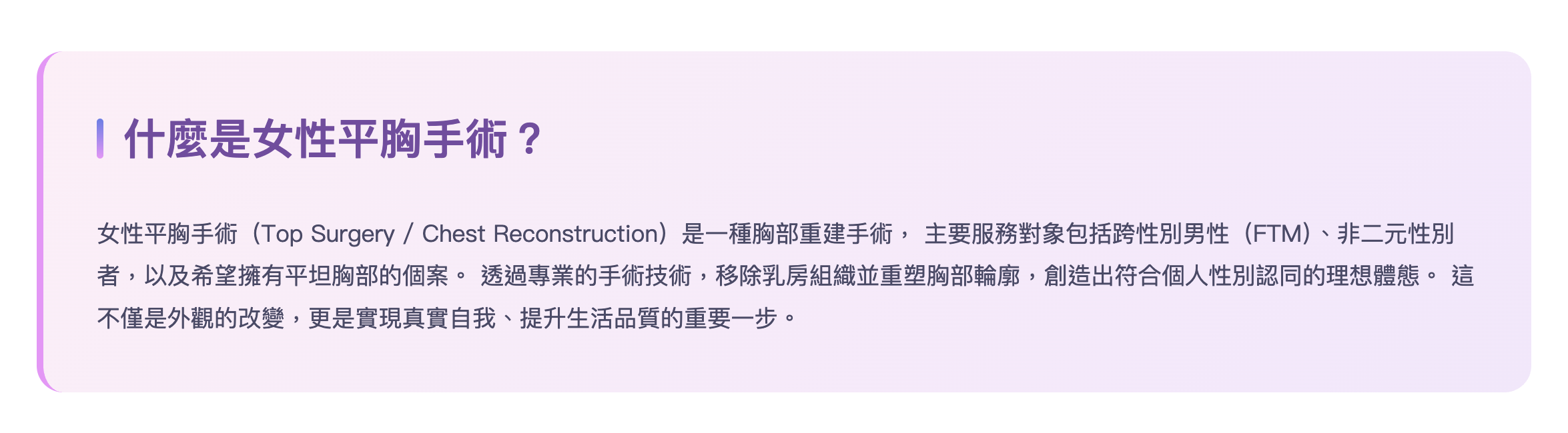 女性平胸手術(Top Surgery / Chest Reconstruction)是一種胸部重建手術,主要服務對象包括跨性別男性(FTM)、非二元性別者,以及希望擁有平坦胸部的個案。透過專業的手術技術,移除乳房組織並重塑胸部輪廓,創造出符合個人性別認同的理想體態。這不僅是外觀的改變,更是實現真實自我、提升生活品質的重要一步。