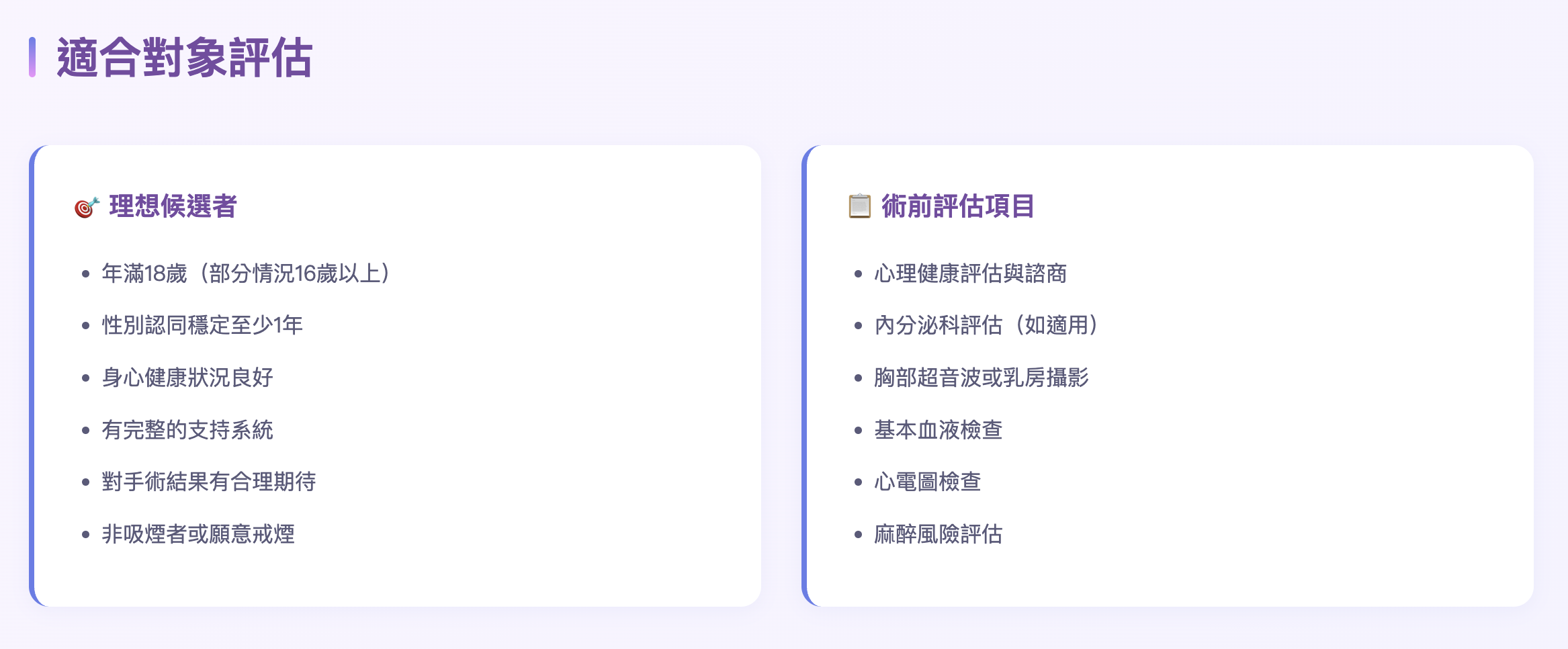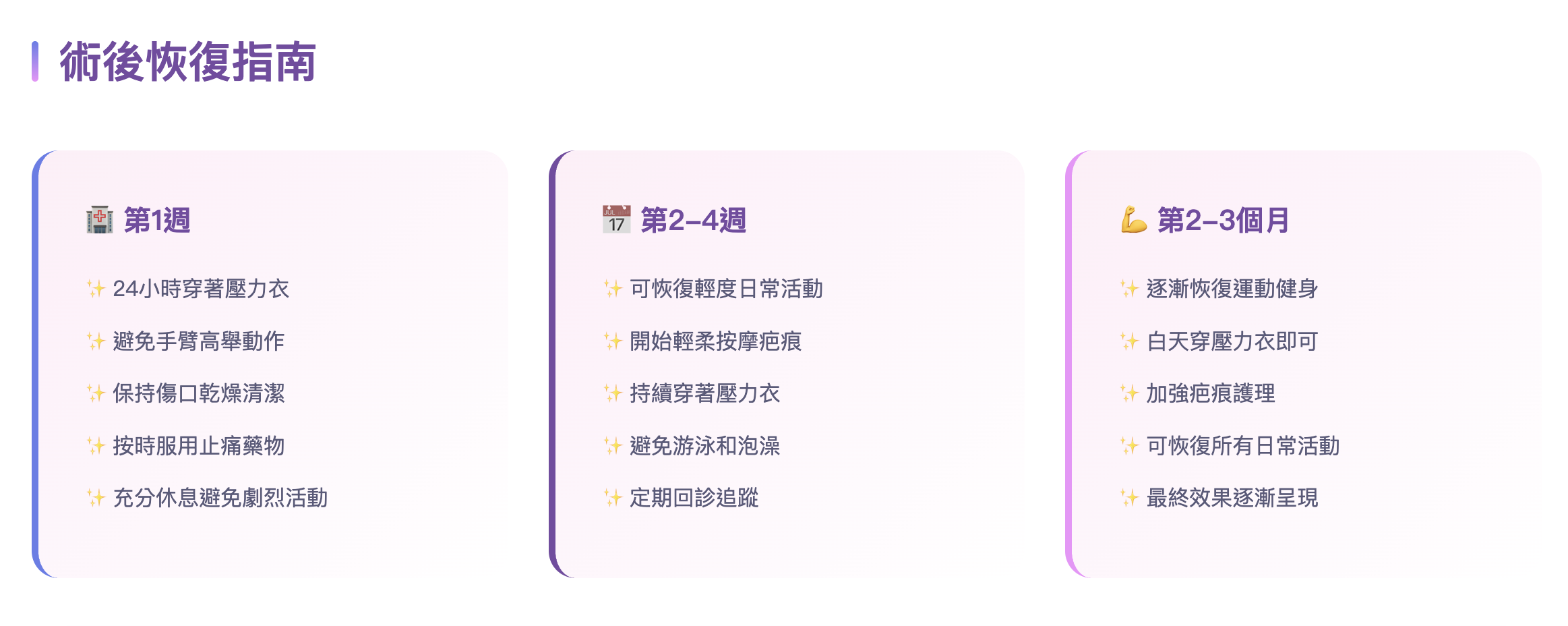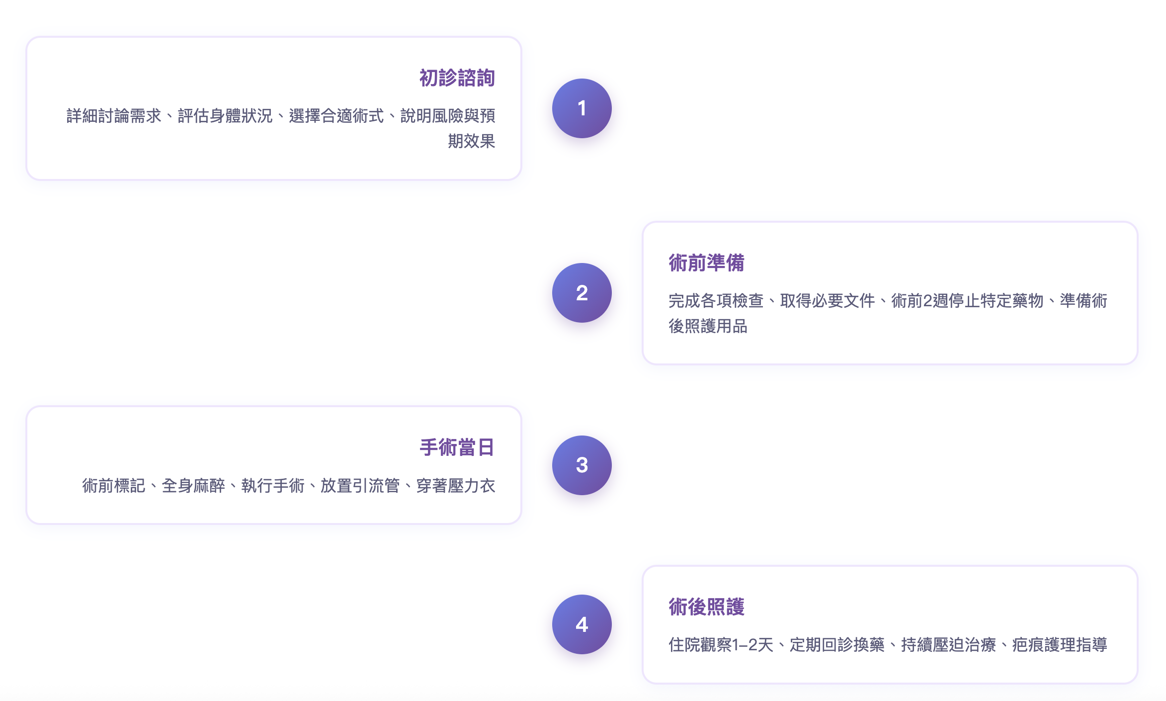 詳細討論需求、評估身體狀況、選擇合適術式、說明風險與預期效果