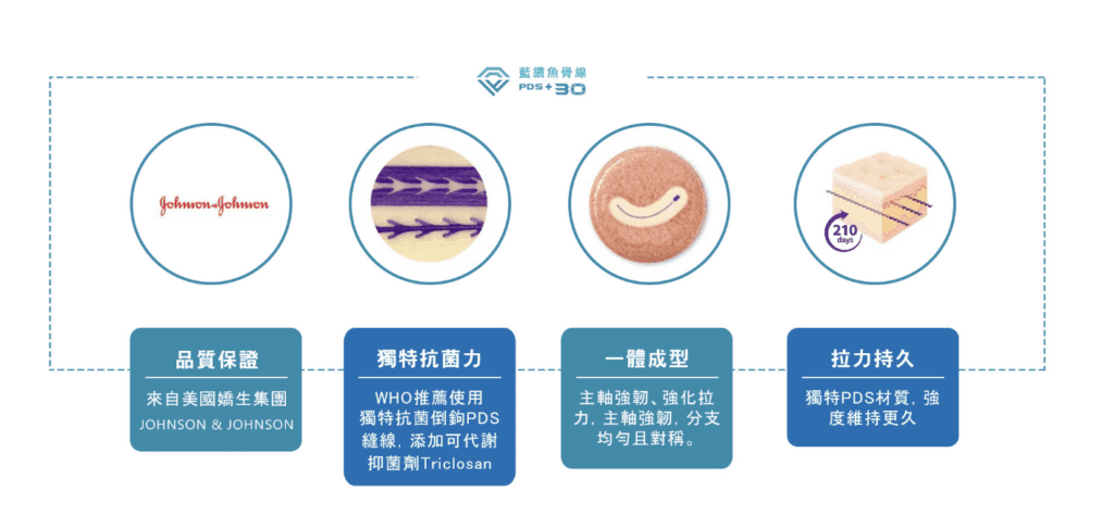 獨家添加Triclosan抗菌劑,能有效抑制金黃葡萄球菌與大腸桿菌等常見菌種,WHO也推薦使用抗菌線材以降低術後感染機率,提升治療安全性。