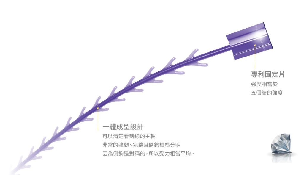 採用一體成型壓模技術製作,線材主軸強韌,倒鉤設計穩固,可承受高達58kg的拉力,不易斷裂或滑脫,能提供持久且穩定的組織支撐。