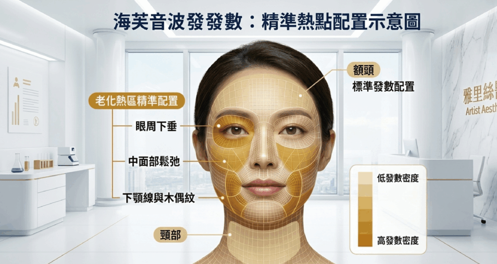 醫師的價值在於對於整場療程的「分配」。這包含如何將總發數分配到不同的臉部區域,以及如何在不同層次間進行穿插。優秀的醫師能根據每個區域的需求,微調發數比例與深度選擇,這屬於技術的高階掌控。